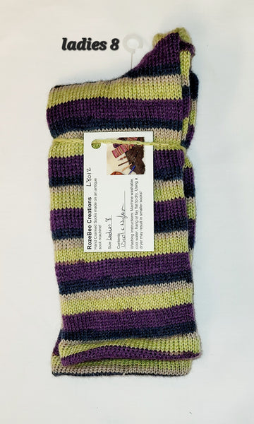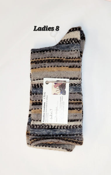 These are made from wool/nylon yarn. They are made on an antique sock machine. If they are labeled as Crazy Quilt Socks they are not made to match!